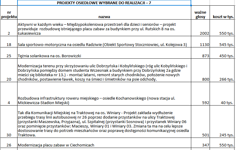 Warunkiem realizacji było zdobycie co najmniej 50 głosów. Na każdą z list przeznaczono po 2 326 050 zł (łącznie 4 652 100 zł). Do realizacji zakwalifikowały się wszystkie projekty osiedlowe: 6 z listy procentowej i 1 z listy rankingowej.
