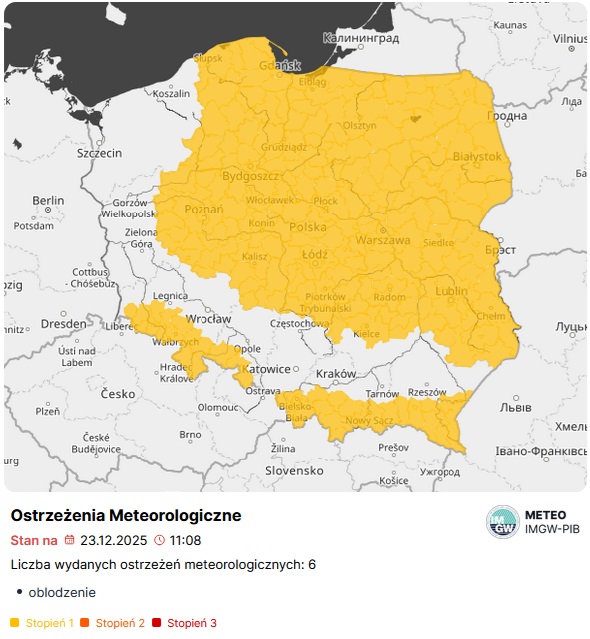 Ostrzeżenie obowiązuje od godz. 15:00 do godz. 22:00 dnia 23.12.2025 r. Temperatura powietrza obniży się do około -4°C, przy gruncie do około -7°C. Ujemna temperatura powietrza utrzyma się przynajmniej przez kolejne dwie doby. Apelujemy o ostrożność.