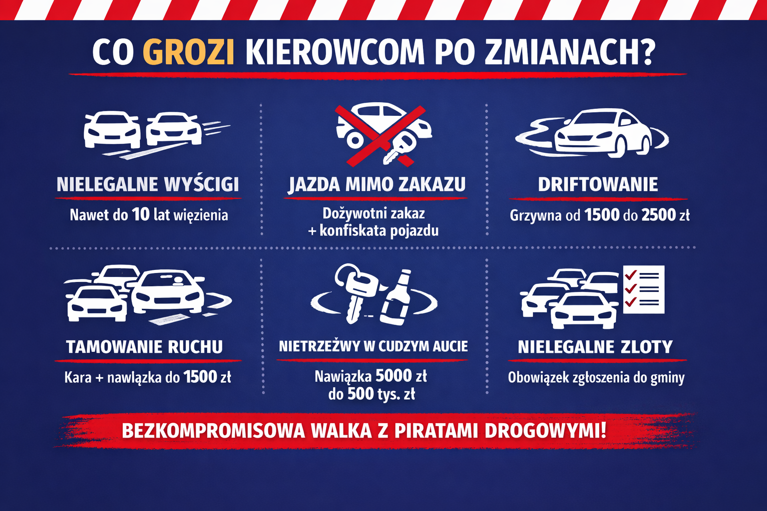 Zmiany obejmują m.in. penalizację nielegalnych wyścigów, rajdów oraz podobnych imprez motoryzacyjnych organizowanych bez wymaganych zgłoszeń. Nowe regulacje mają ograniczyć brawurową jazdę, eliminować recydywistów oraz zwiększyć bezpieczeństwo wszystkich uczestników ruchu drogowego.