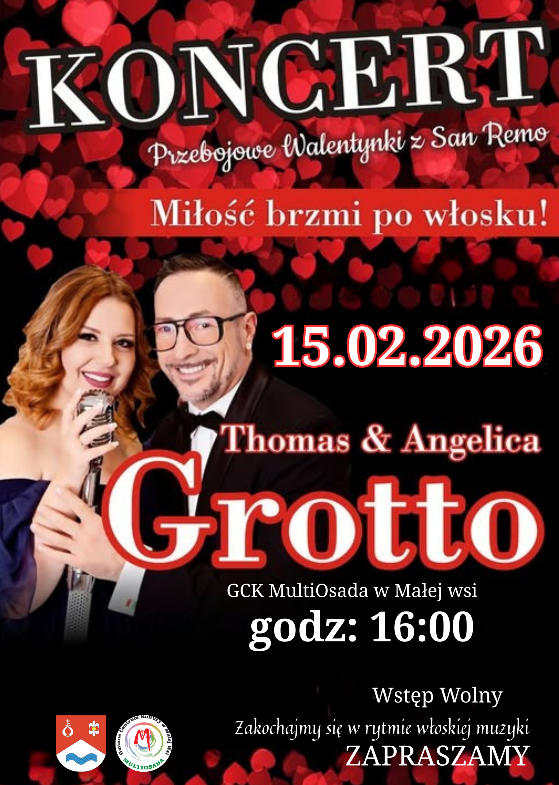 Już 15 lutego o 16.00 „Przebojowe Walentynki z San Remo”. Na scenie Thomas & Angelica Grotto, którzy zbiorą w romantyczną podróż do słonecznej Italii. Zabrzmią najpiękniejsze włoskie piosenki o miłości, pełne pasji, wzruszeń i niepowtarzalnego klimatu San Remo, bo przecież miłość brzmi po włosku!