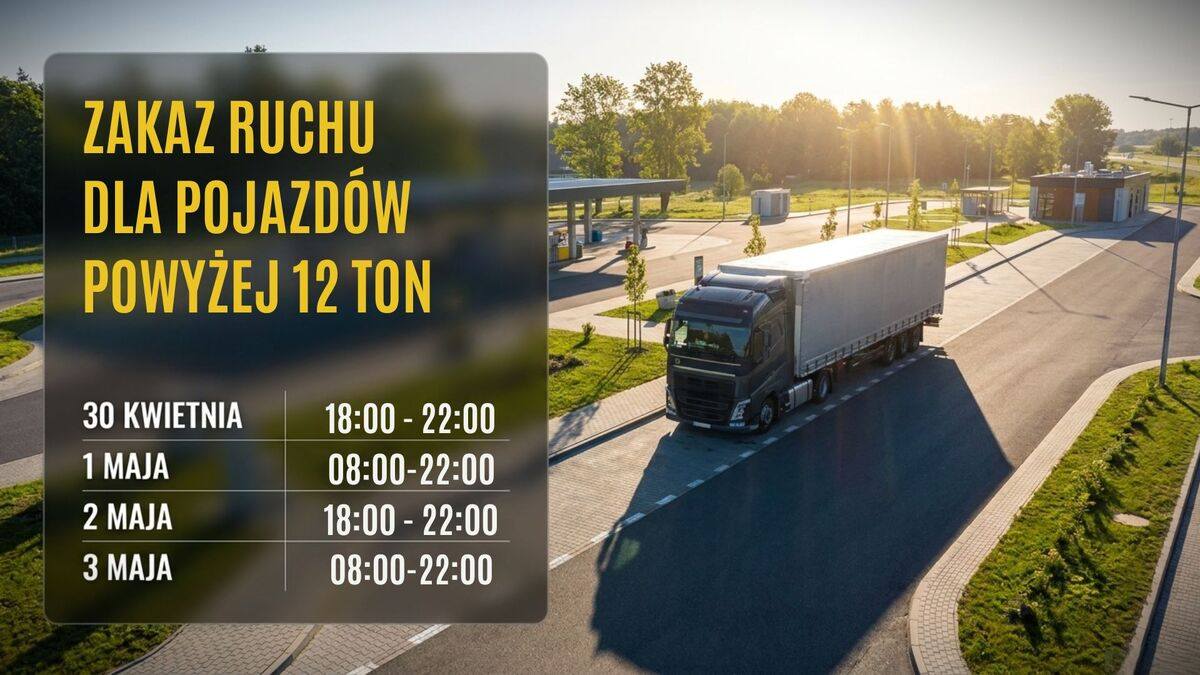 Przypominamy, że obowiązuje zakaz ruchu pojazdów powyżej 12 ton w dniach: 30 kwietnia i 2 maja (18:00–22:00) oraz 1 i 3 maja (8:00–22:00)